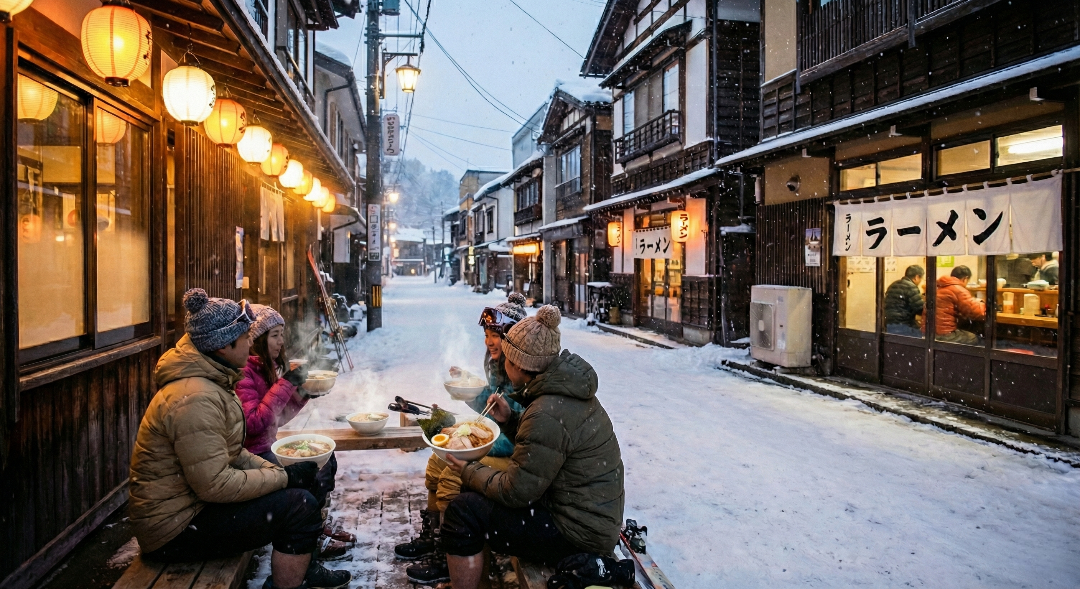 After a cold day outdoors, ramen feels like a reward. The broth is rich. The noodles are filling. Steam fogs the windows of small shops as skiers crowd inside.
